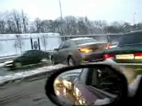 Пробка: красное авто поворачивает налево, убедившись что его пропускает встречный поток. После пересечения встречки в него влетает белое авто, объезжавшее пробку по обочине.