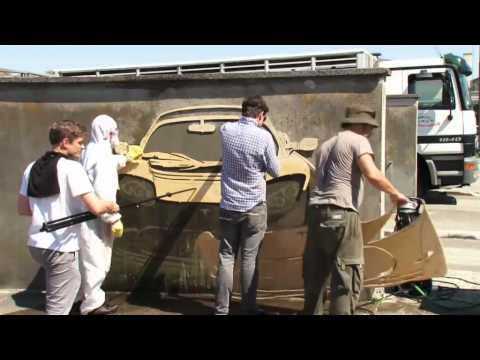 Накладывая трафареты и поливая стену струёй воды, художники создают граффити на автомобильную тему. На расписанных ими стенах можно увидеть Tesla Roadster , Renault Twizy и многие другие машины.