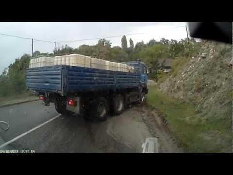 Камазист не видел пробку за слепым поворотом, начал поворачивать, зацепил обочину, начал торможение и поехал боком. Такие вот дела.